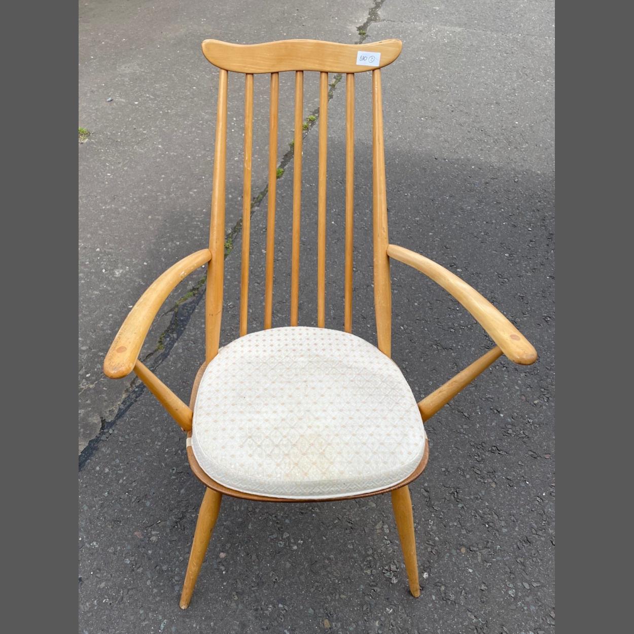 A STUNNING ERCOL inspired armchair with beautiful patina arms and legs and a light brown fabric cover