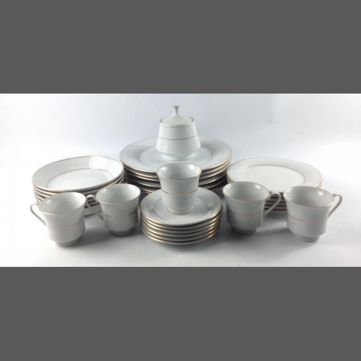 CROWN MING china in white with a gold rim to include 5 cups, 6 saucers (15cm dia), 6 side plates (19cm dia), 6 bowls (19cm dia), 6 plates (27cm dia), 1 lidded sugar bowl