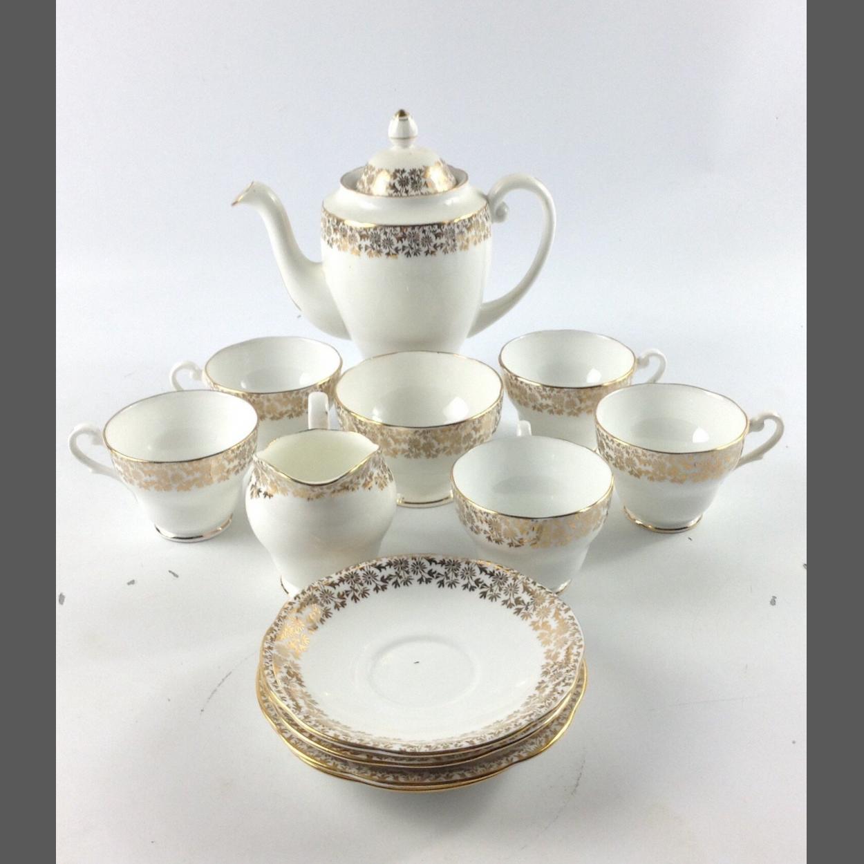 An English FINE BONE CHINA coffee service in white with a gilt floral design to consist of 6 cups (1 damaged/repaired), 4 saucers, 1 milk jug, 1 sugar bowl and 1 coffee pot