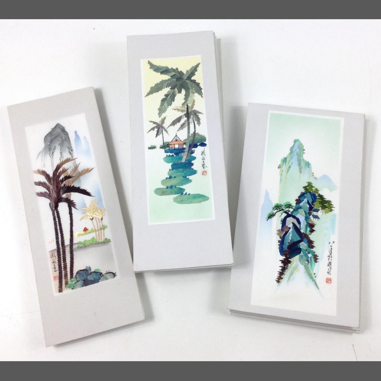 A box of original vintage CHINESE SILK pictures (30 x 17cm) of 3 designs of 3, 4 and 13 copies of each design.