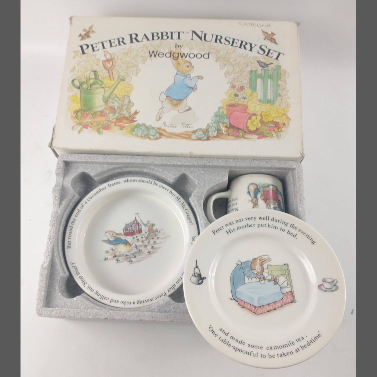 A boxed PETER RABBIT NURSERY SET by WEDGWOOD consisting of mug, plate and bowl