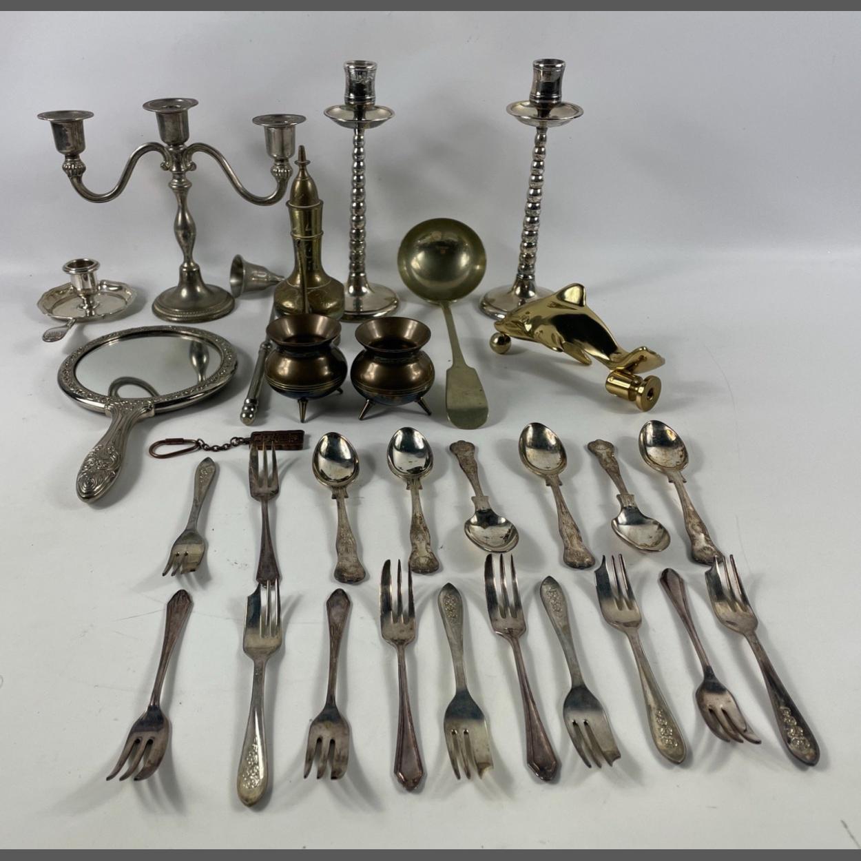 A collection of mainly white metal implements to include a pair of candlesticks (22cm high), a soup ladle, a candle snuffer, a hand-held mirror, a box with 6 EPNS teaspoons and a dozen dessert forks in 2 designs, plus a pair of extremely heavy brass cauldrons only 6cms high and a brass dolphin etc
