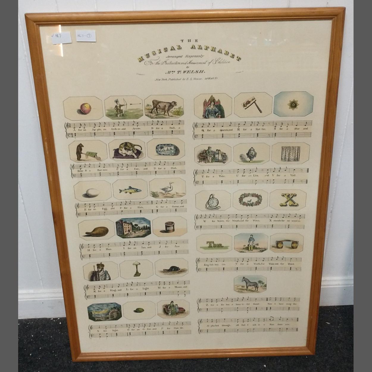 A large framed picture of The Musical Alphabet for a child, frame size 85 x 62cm