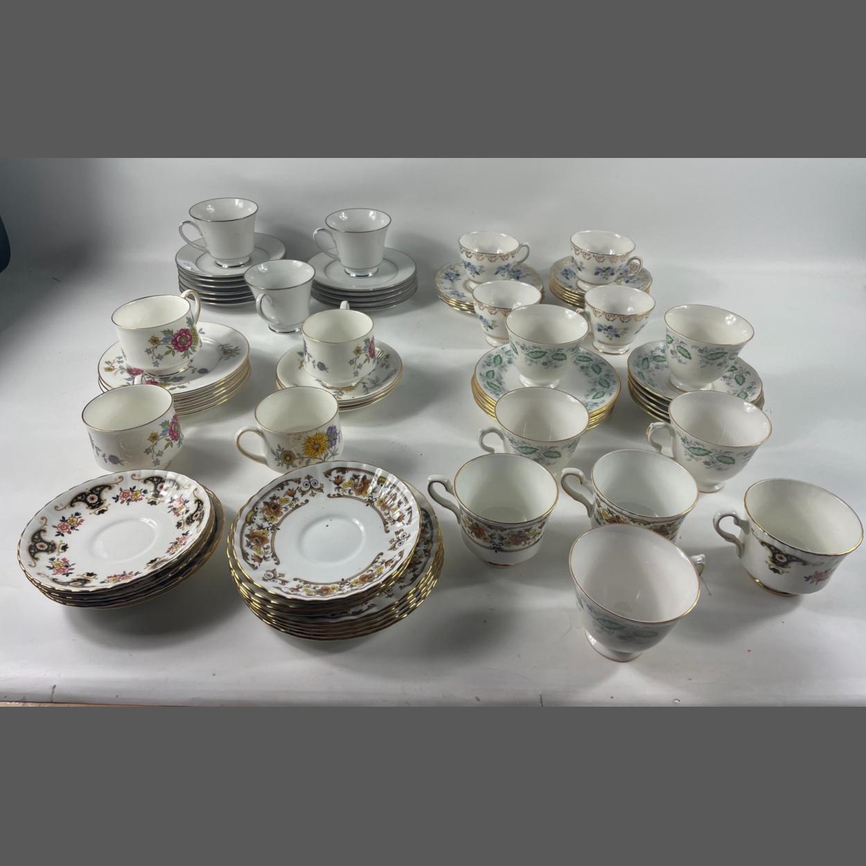 A collection of mixed part tea services to include PARAGON 'Cered' - 4 cups, 3 saucers and 6 side plates; COLCLOUGH - 4 cups, 4 saucers, 4 side plates; QUEEN ANNE - 5 cups, 5 saucers and 6 side plates, ROYAL STAFFORD 'Clovelley' 2 cups, 3 saucers, 5 side plates, ROYAL STAFFORD - 1 cup and 4 saucers, NORITAKE "Legendary Regency Silver' - 3 cups, 6 saucers, 5 side plates,