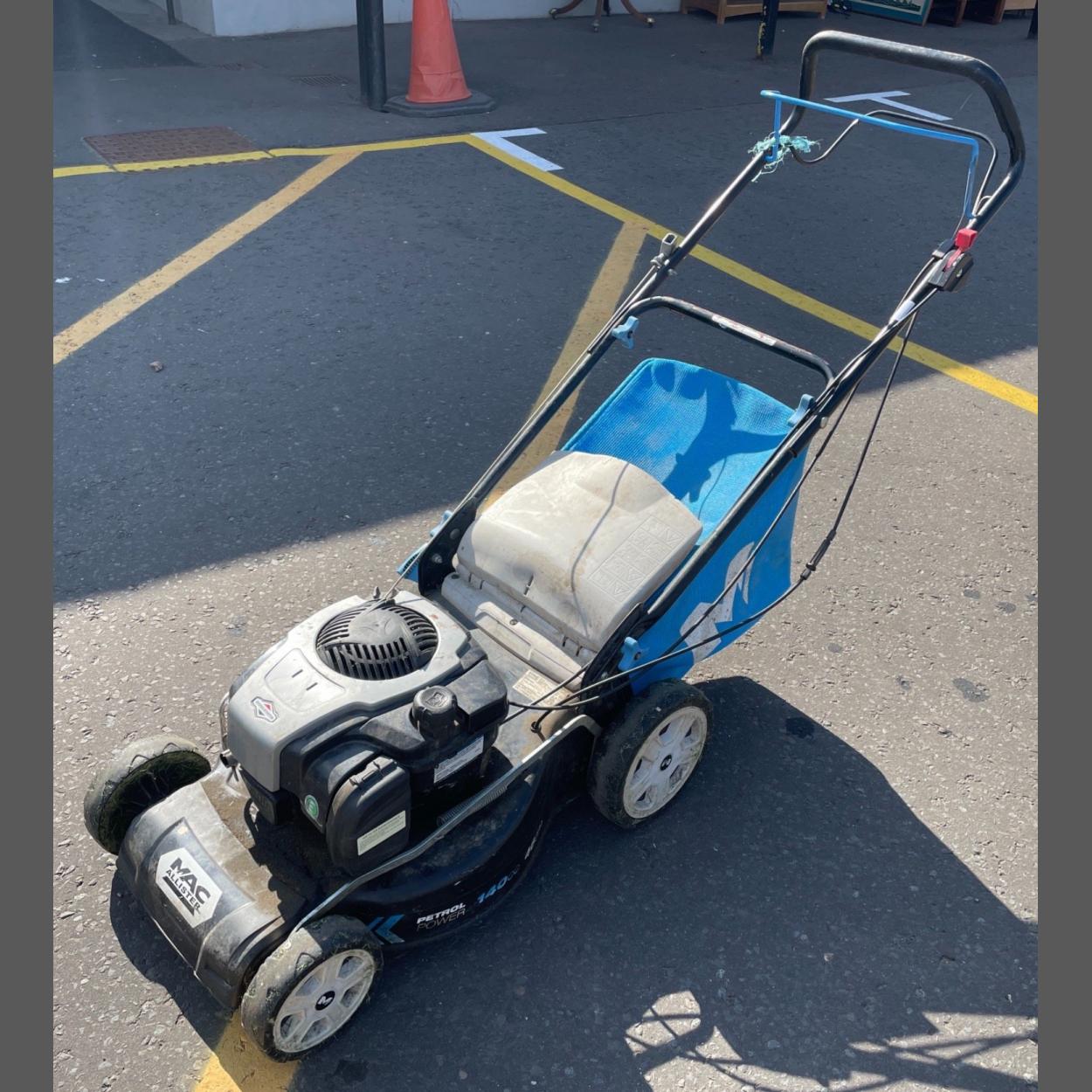 MACAlistair 46cm cut Briggs and Stratton engine, starts(started with us) and runs well according to the owner with grass collection net