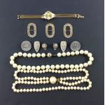 A mixture of VINTAGE costume jewellery to include two strings of faux pearls, a ladies bracelet watch, various brooches etc etc