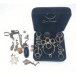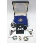 Collection of jewellery to include Dracomagnet 800 stamped silver pendant, 925 silver stamped ring with large black oval shaped stone, pair of white metal earrings with purple stones, pair of striped mother of pearl triangle shaped pendants, Siam style brooch made in Thailand, white metal pendant with clear stone, 2 Alpaca mother of pearl style pin brooches? and similar style 925 silver marked earrings
