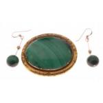 A pair of VINTAGE 14/20 gold-filled fish hook drop earrings with a green stone on each length 3.5cm and a brooch (5cm approx) with a green stone