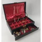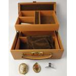 A brooch with two ladies and a troubador 4cm long, a pendant with a rose design 4cm long, plus a tan 2-layer cantilevered jewellery box with brown velvet lining, 23 x 17 x 10cm high