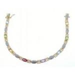 Yellow metal bracelet stamped 18 and 925 (18kt gold plated over 925 silver) set with various colour stones, spaced with very small diamonds (tested) with a double scroll pattern joining the sections together.