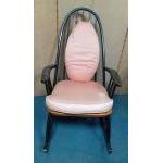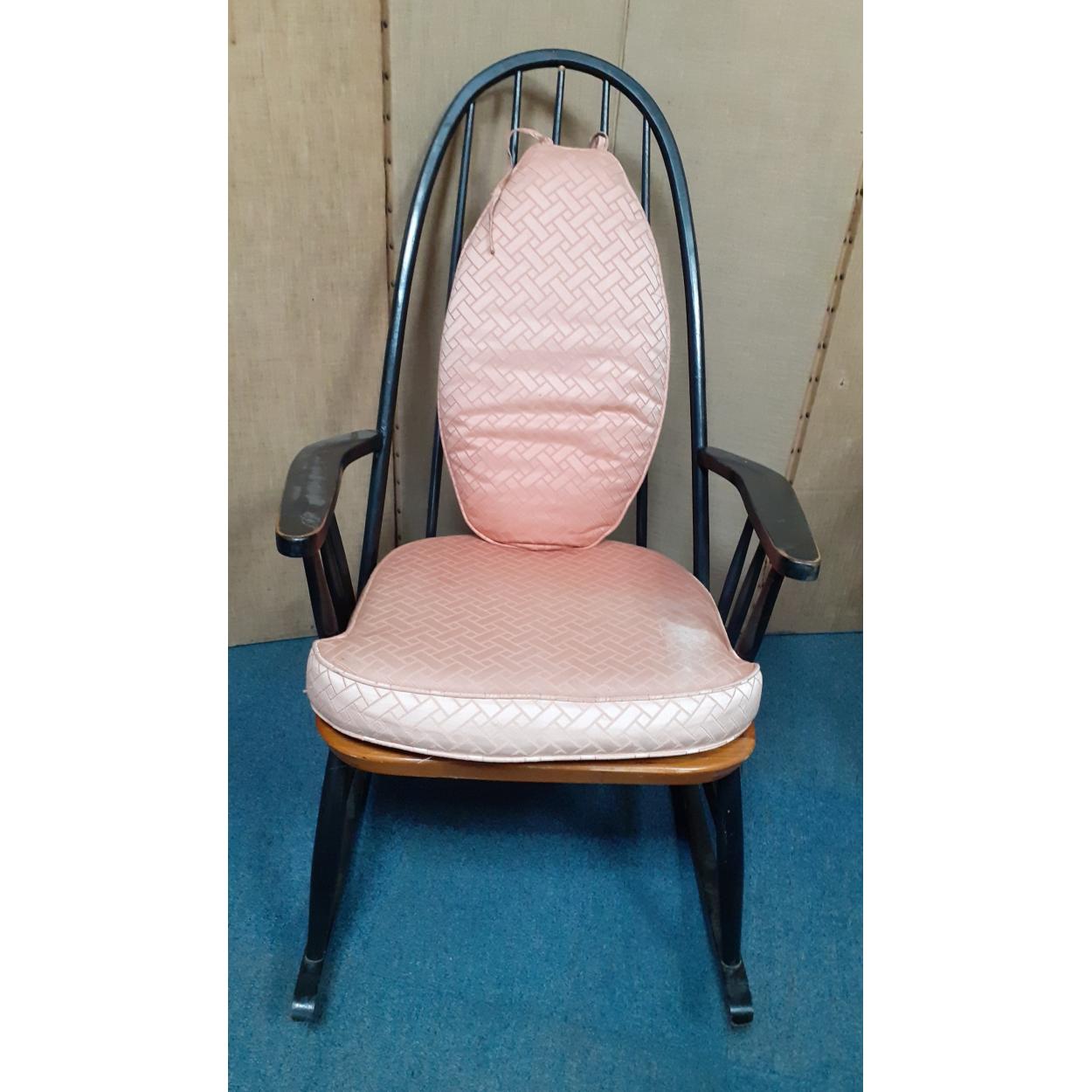 A very comfy black painted wooden rocking chair with salmon pink seat and back cushions measuring approx. L84cm x W60cm x H104cm. The black paint is slightly worn in areas and the cushions are slightly marked. A great upcycling project!