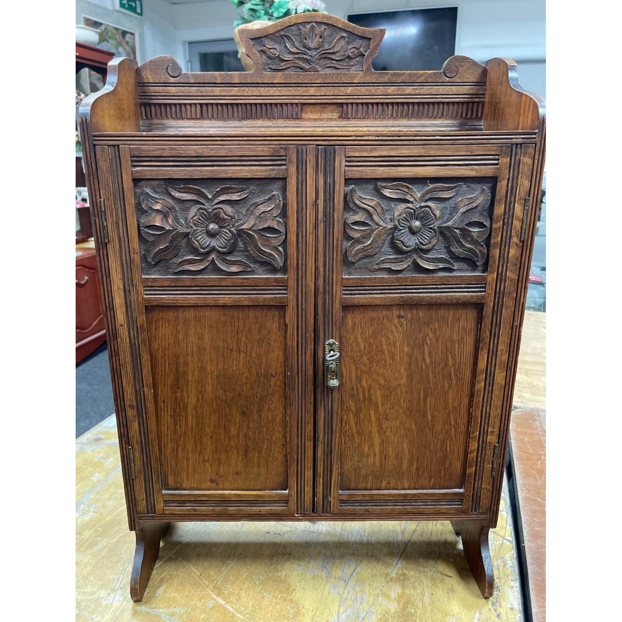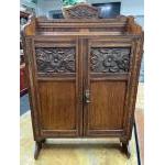 ANTIQUE QUALITY! - A HAND-CARVED wooden wall cabinet with two small drawers with original brass handles and three shelves for storage - dimensions 25” x 16” x 7” depth approx, there is a small piece of wooden trim missing just below the finial. This in no way detracts from the beauty of this piece!