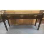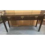 A STYLISH ORIENTAL inspired long console table finished in a black lacquer paint with three drawers - dimensions 150cm length x 40cm depth x 60cm height - would also make an ideal media table for your super large TV etc - one of a pair