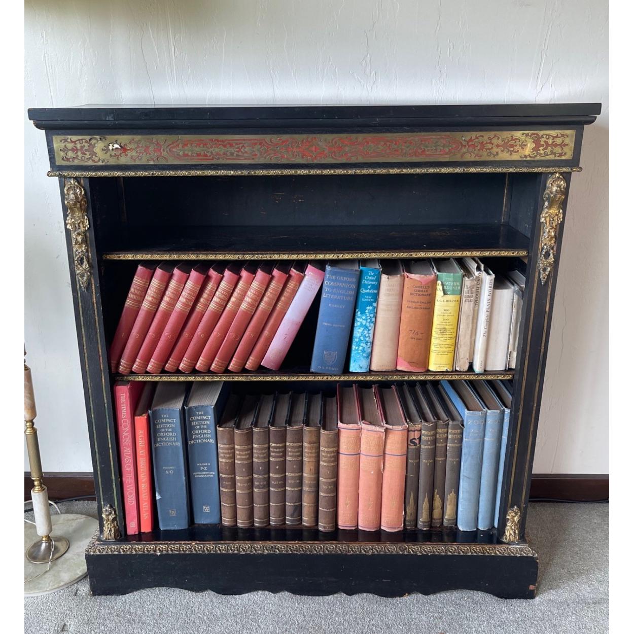 AN ORIENTAL inspired antique three shelf bookcase with brass detail and ebonised wood finish - an UNUSUAL piece! - dimensions 104cm wide x 110cm height x 35cm depth approx. Contents not included.