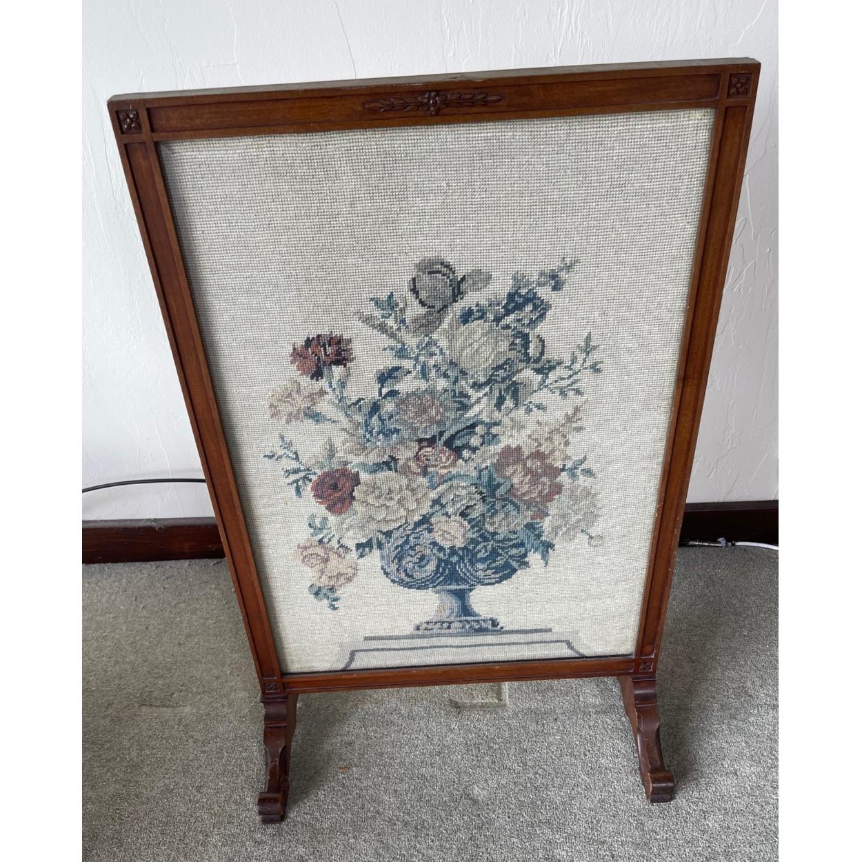 A VINTAGE oak framed fire screen on two leg supports with a hand-worked tapestry floral scene behind glass - dimensions 2ft height x 18" wide approx