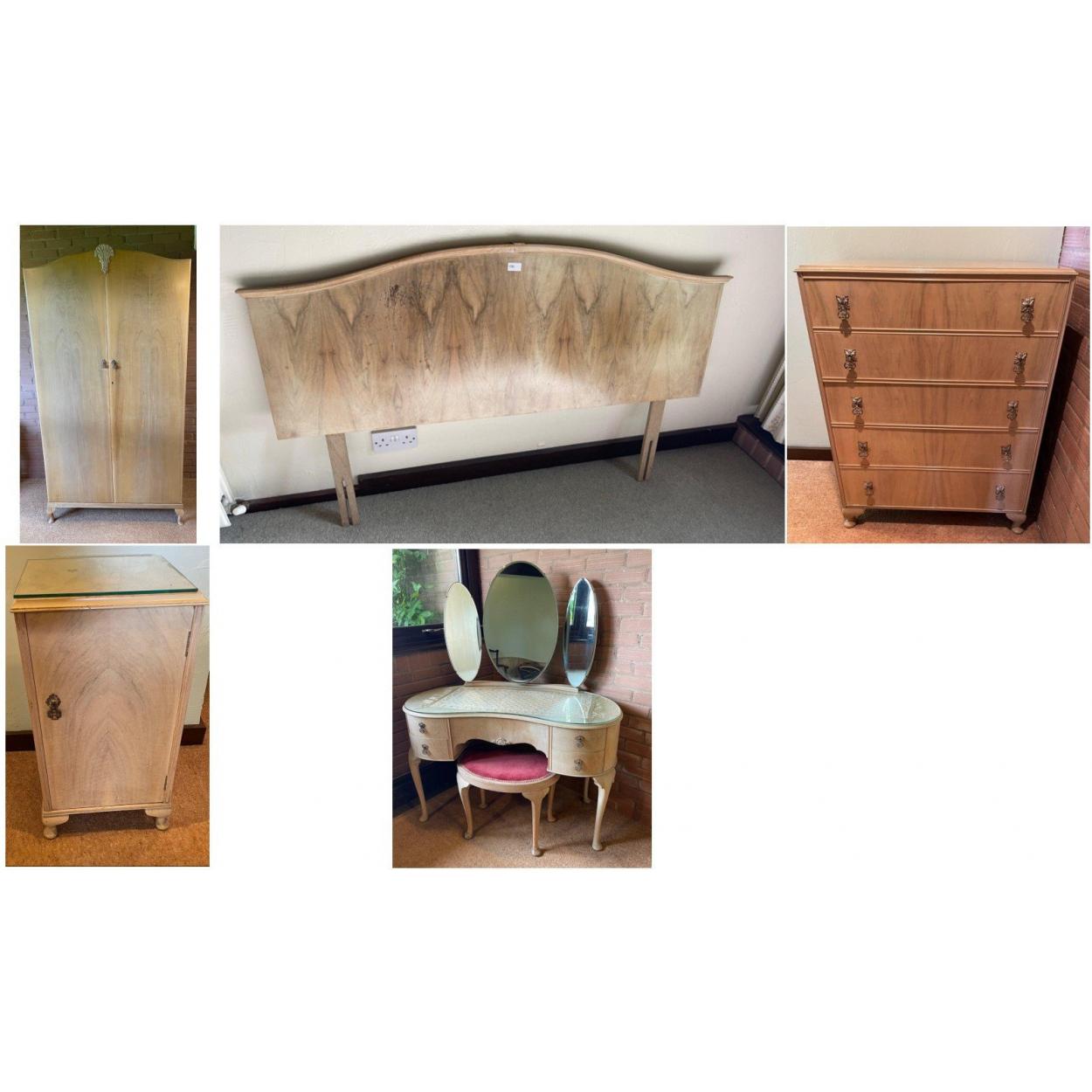 VINTAGE c1960's BEDROOM SET - A VINTAGE Birds Eye maple effect bedroom 5 drawer chest of drawers, a tall two door wardrobe, a dressing table with stool, bedside cabinet and double bed headboard - If unsold, this will be split into individual lots