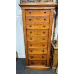 An EDWARDIAN TOP QUALITY tall 9 drawer chest of drawers with original wooden knob drawer handles, with a right-hand side secure lockable bar with key - in stunning condition! - dimensions 64" tall x 7" wide x 17" depth approx