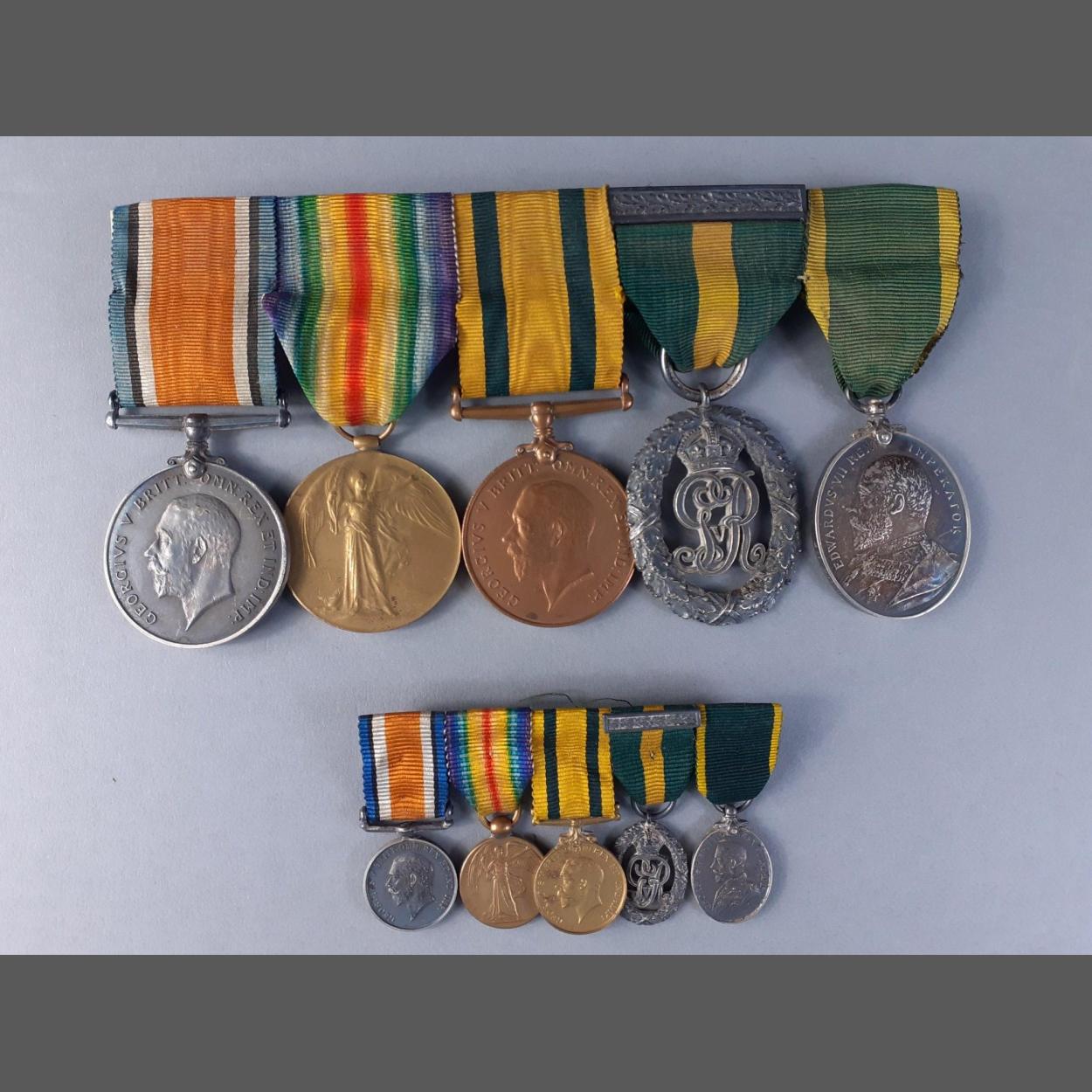 WWI medal group to Sgt. / Lieutenant 431 GS Jackson Lanarkshire Yeomanry / R.A. interest. A very interesting medal group to a gentleman who clearly had a very interesting career. Group includes the rarest of the World War One Campaign Medals, the Territorial Forces Medal with less than 34,000 issued and also a sterling silver George V Efficiency Medal. All bar mounted and supplied with matching miniatures. Territorial medals show him as a Sgt. War medals show him rising to Lieutenant. A very interesting and scarce group.