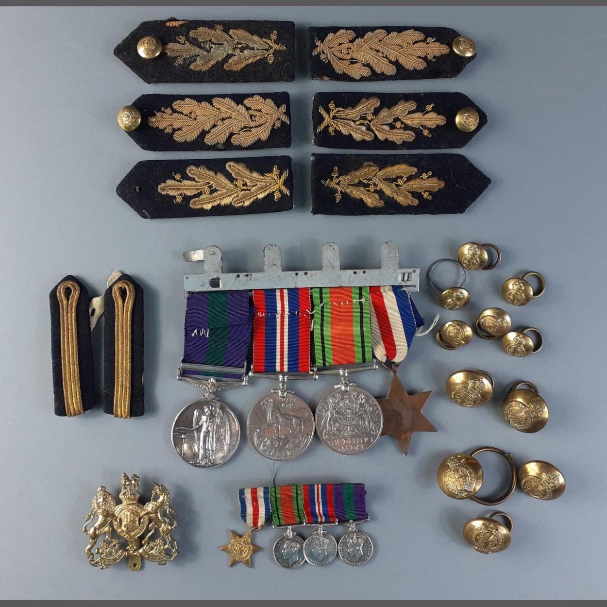 WWII Medal group with miniatures including named PALESTINE medal to 14467726 Gnr. POYNTON R.A. complete with matching miniatures. Lot includes some shoulder boards and buttons.