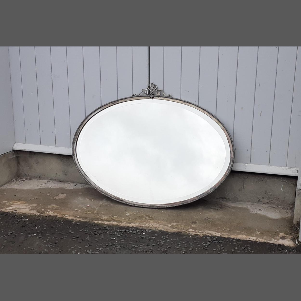 A NICE QUALITY white metal finial topped and framed oval wall mirror - 2ft diameter approx
