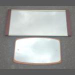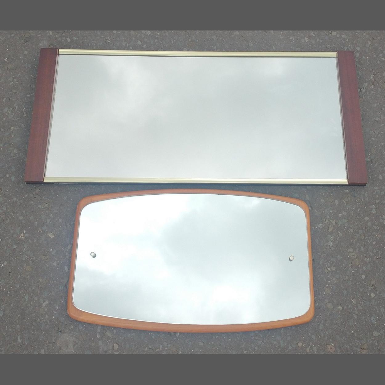 A useful pair of mid sized useful wall mirrors. One with dark wood and gilt frames 80 x 36cm approx, the other with a curved wood frame 52cm x 30cm approx.