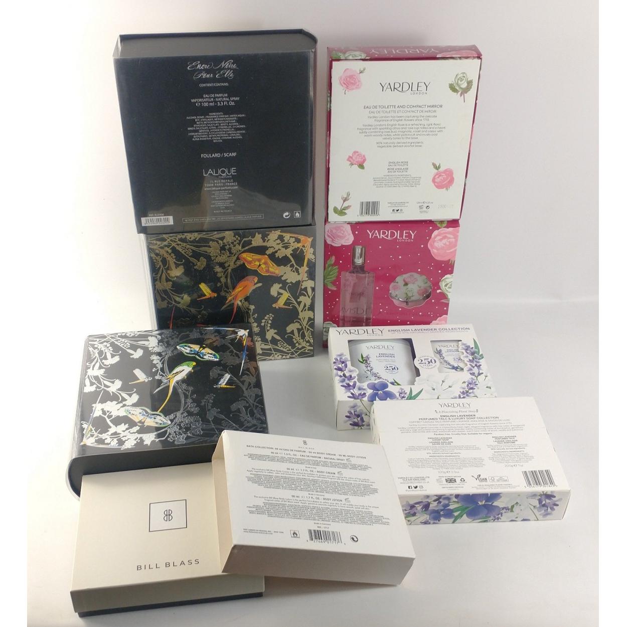 Shop early for Christmas - three LALIQUE PARFUMS with scarf in presentation boxes - 1 Perles de Lalique and 2 Encre Noire, plus a BILL BLASS bath collection, also 2 YARDLEY English Rose gift boxes with English Rose Eau de Toilette and a compact mirror, 2 YARDLEY English Lavender gift sets of talc and soap,