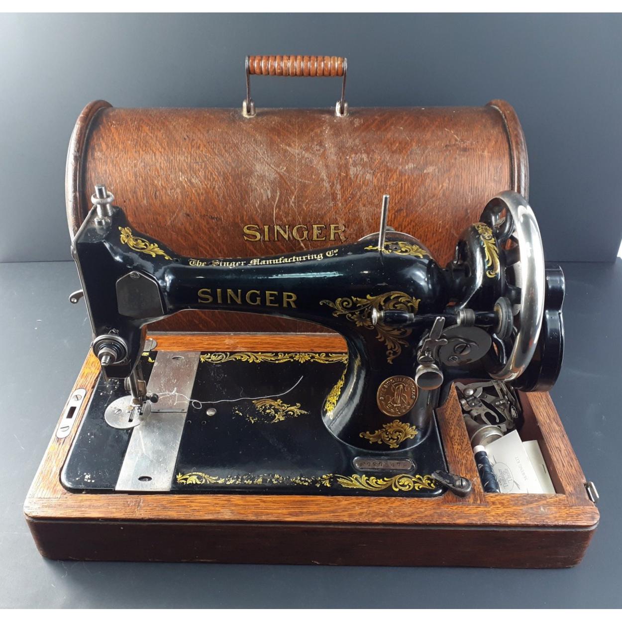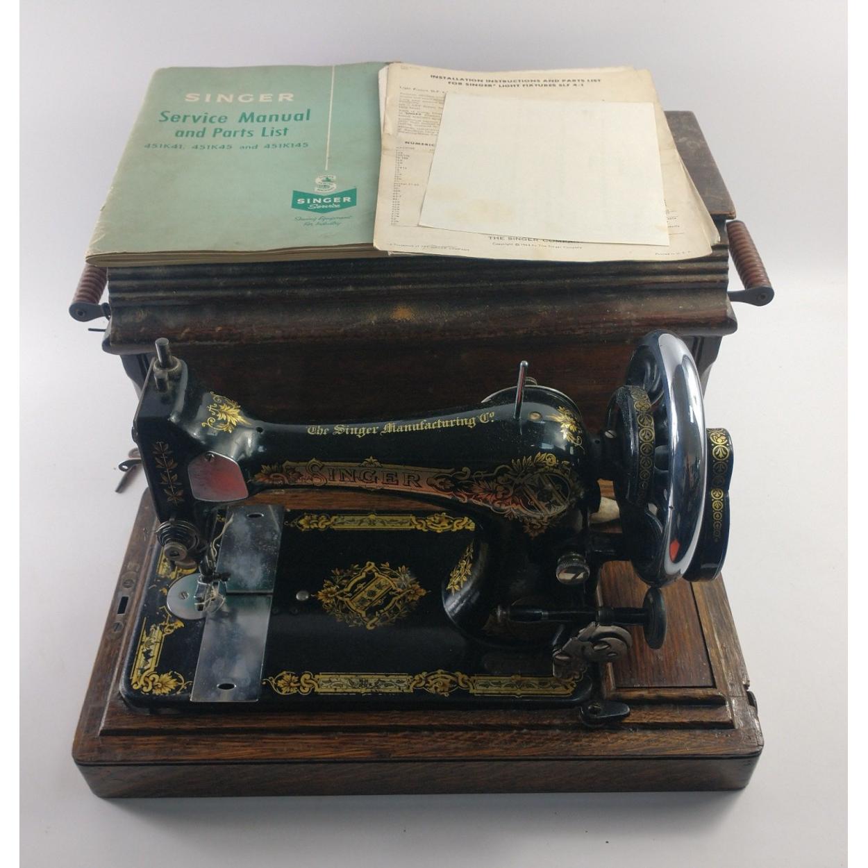 A vintage SINGER sewing machine (reg. F1368019) in a wooden case, dates to 1911, with instruction manual - complete with amendments dated April 1964