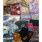 A box rammed full of new, unused scarves and blankets, all in original wrappings,