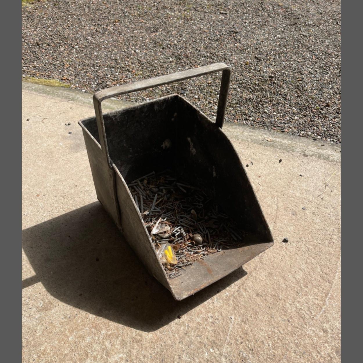 A really HANDY WORKSHOP galvanised metal scoop-style bucket (includes contents nails etc) - dimensions 1ft across x 1ft height approx