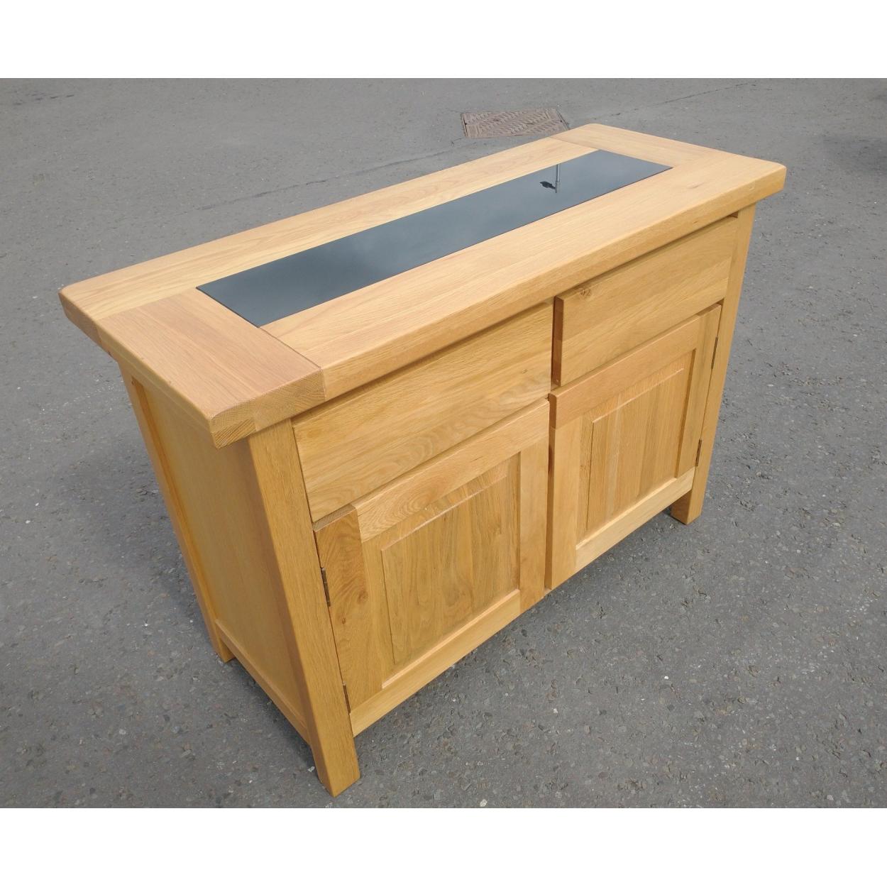 Modern SOLID OAK sideboard with black glass inset, 2 drawers and 2 doors 148cm width x 28cm depth x 85cm height