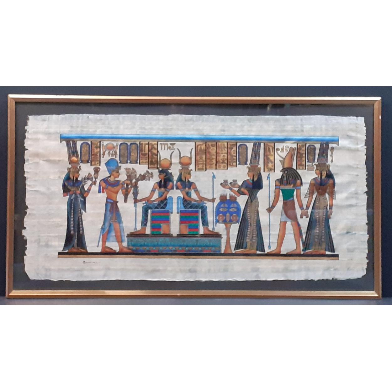 A large and attractive Egyptian framed papyrus art work piece. Colourful and impressive piece. 53cm x 100cm approx. Nicely framed in subtle gilt frame.