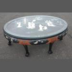A stunning Oriental oval coffee table with amazing inlaid mother of pearl figures protected by a glass top. 120cm wide approx. A truly amazing statement piece.