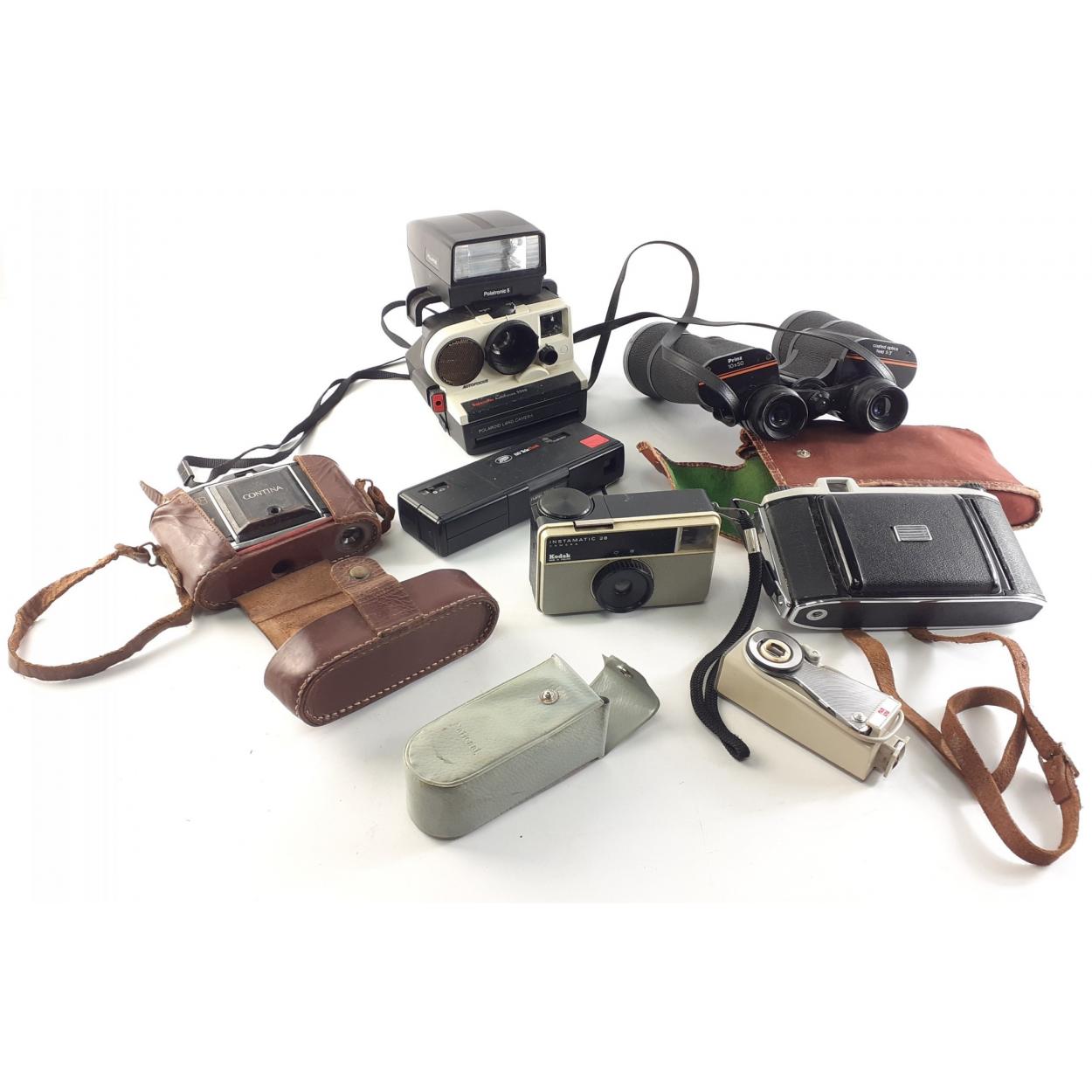 A collection of cameras to include POLAROID land camera, a ZEISS IKON CONTINA camera along with a set of PRINZ 10 x 50 binoculars.