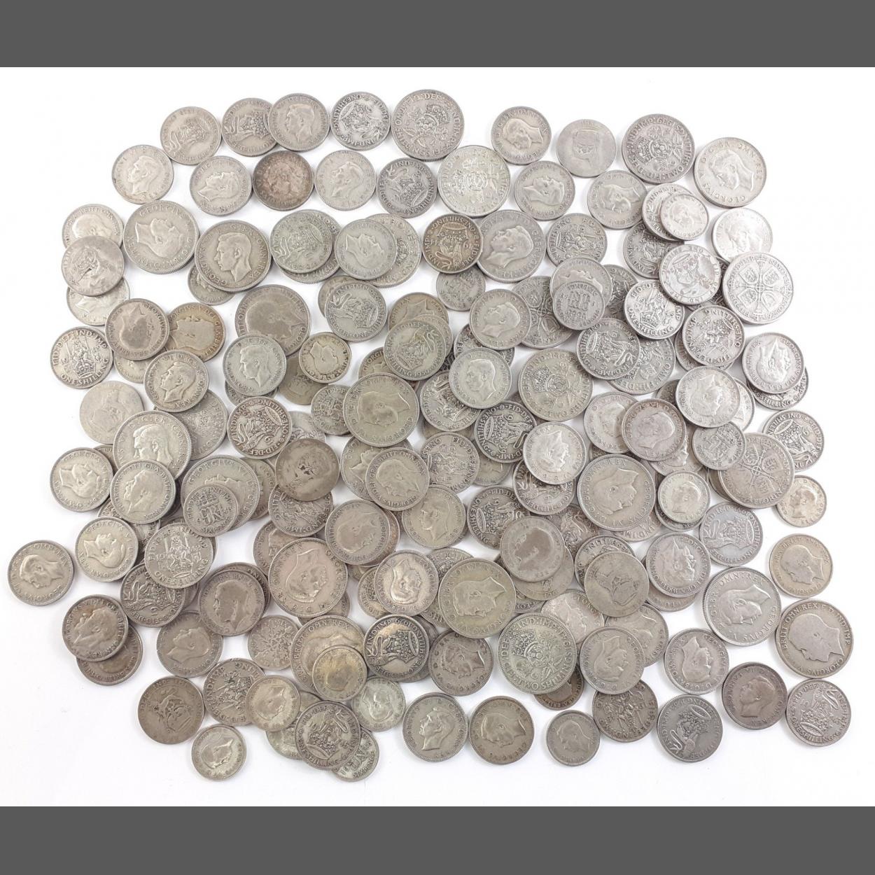 A good quantity of pre-1947 0.500 silver contents coinage. Sixpences, shillings, florins Gross weight 1040g approx.