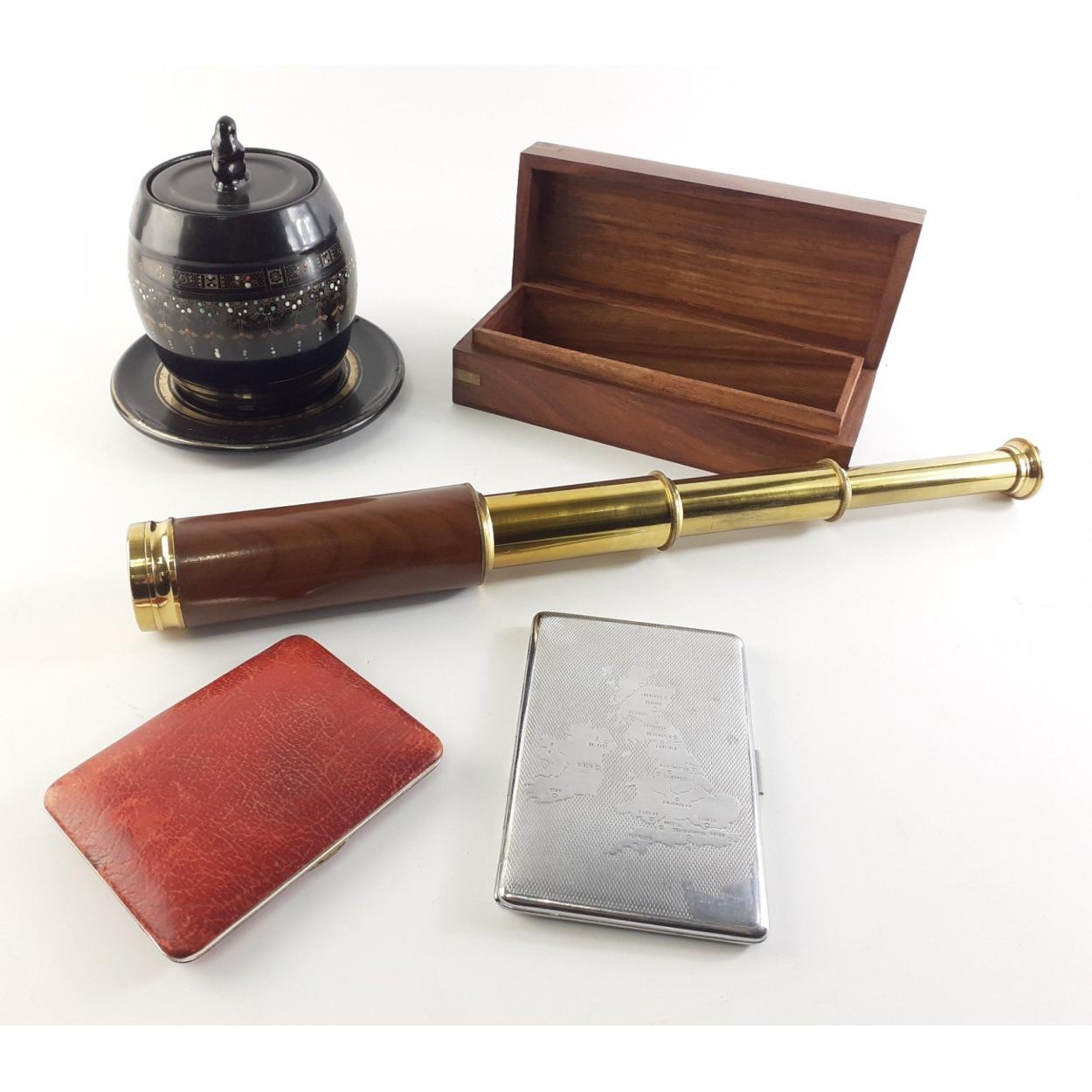 An antique black ceramic tobacco jar on plate (11cm to lid approx), a Clifton leather clad cigarette case, a HAR-BRO turned cigarette case with map of UK. Also a small telescope in wooden presentation box