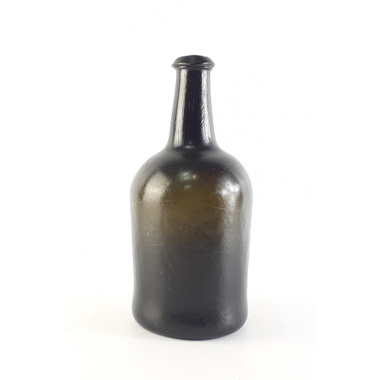 A squat dark green glass beer bottle of the late Georgian period, c1800. A wonderful tactile piece in lovely condition. Stands 24cm approx