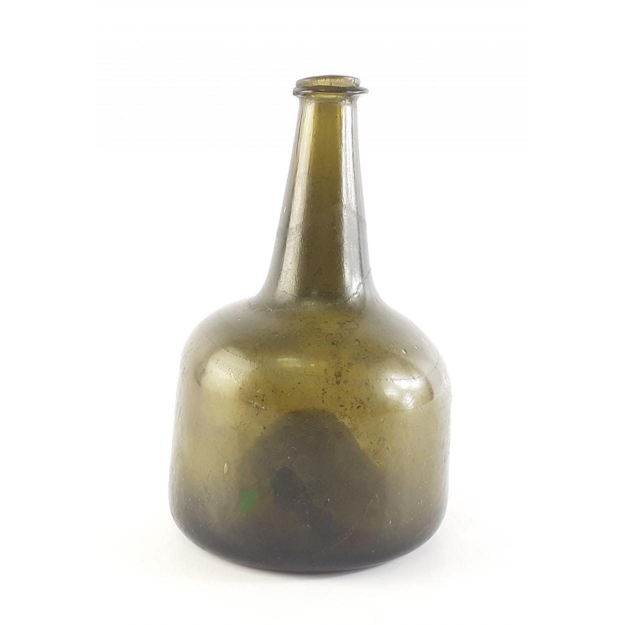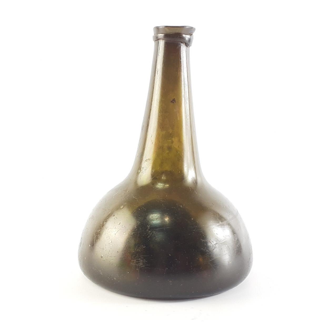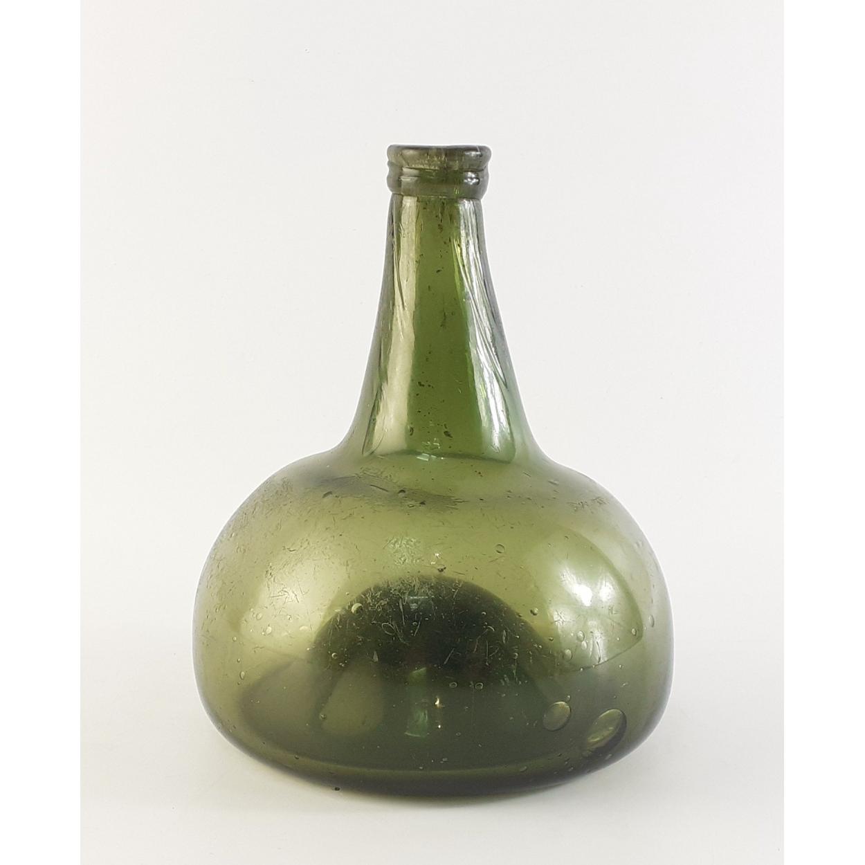 An 18th century Dutch onion green glass bottle hand-blown with rough pontil. Wonderfully clear and lots of visible bubbles. A superb example. Stands 18cm high approx