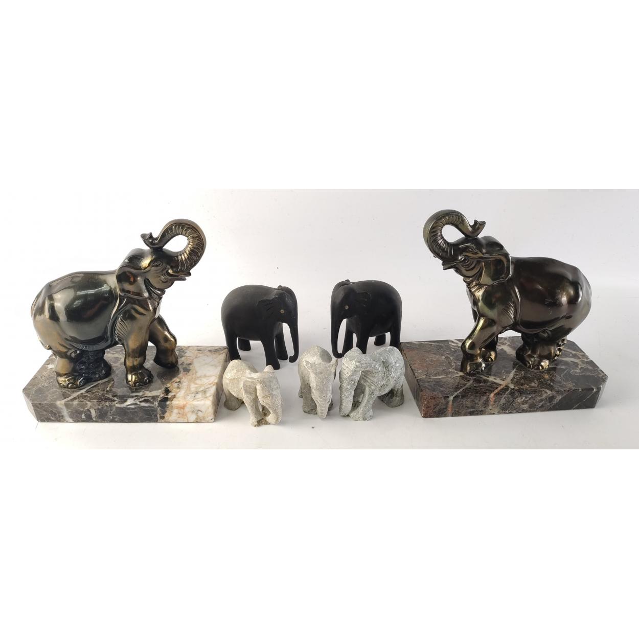 A small herd of ELEPHANT ornaments. Comprising a pair of bronze effect bookends and six other stone and hardwood pieces.