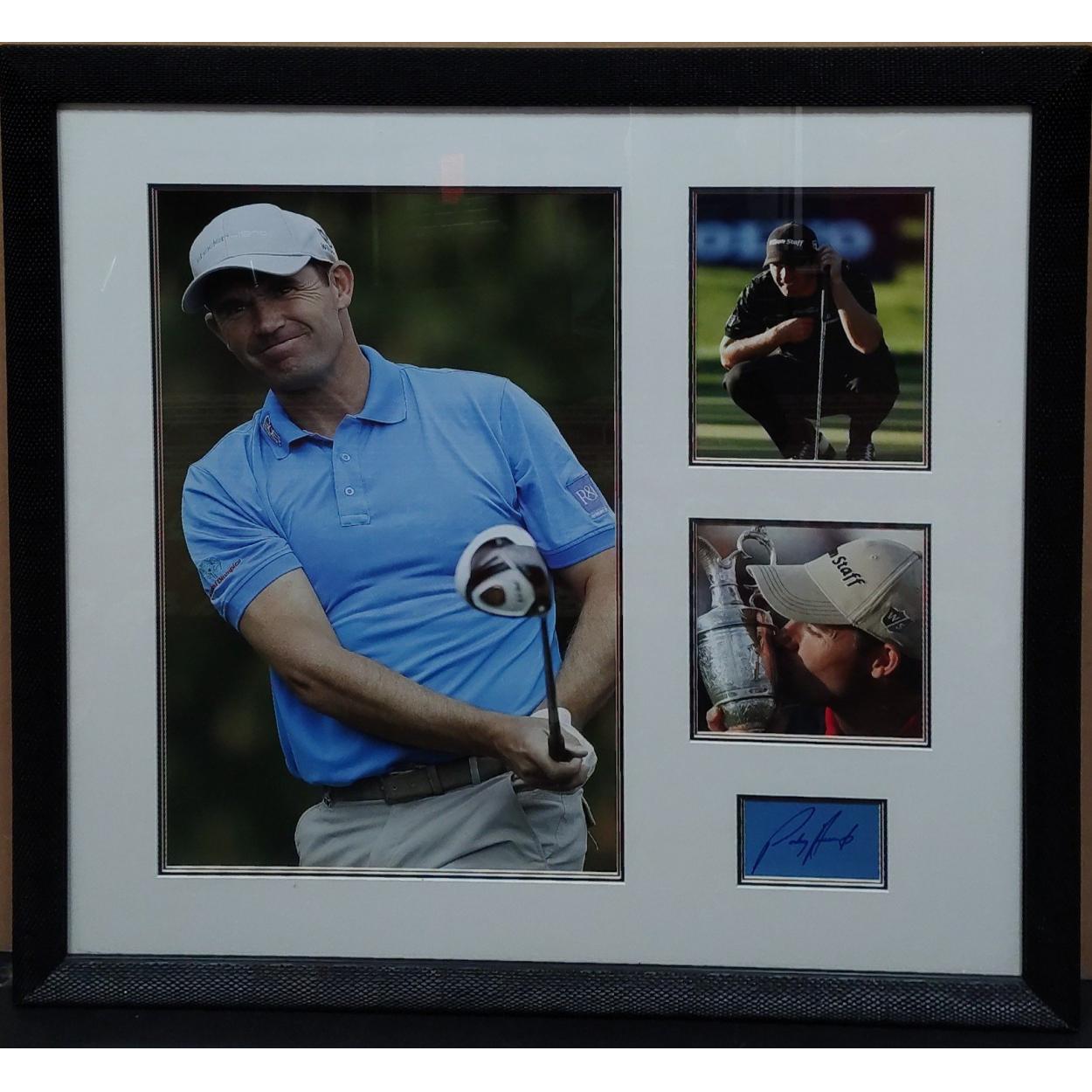 PADRAIG HARRINGTON framed presentation piece with signature. 89 x 92cm approx