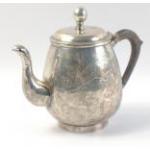 Chinese white metal Dragon teapot standing 15cm high approx and weighing 360g approx. Rather attractive engraving with a wooden handle. The lid hinge is broken but the body of the teapot is in good order with no major damage, would look rather superb polished.