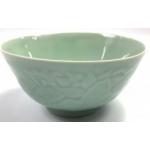 A Chinese celadon bowl (15cm dia) with an embossed design of carp, with four characters signature to base