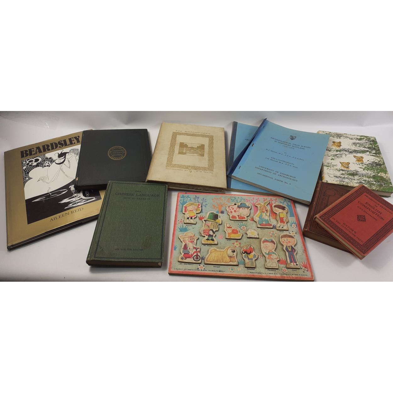 An eclectic collection of books to include a hand-cut limited edition (195/350) of The Roadmender by MICHAEL FAIRLESS published by Duckworth & Co in 1911; Notices of The Spalding Club, Aberdeen, 1839-71, printed in Edinburgh by Robert Clark 1871;The Chinese Language: How to Learn It vol 2 by SIR WALTER HILLIER published by Kelly & Walsh, Shanghai, 1923; Reminiscences of Scottish Life and Character by EB RAMSAY 98th edition published by Gall & Inglis, an A3 size book of Beardsley by Aileen Reid; Living Free by JOY ADAMSON etc plus a MAGIC ROUNDABOUT shape sorter jigsaw puzzle - complete