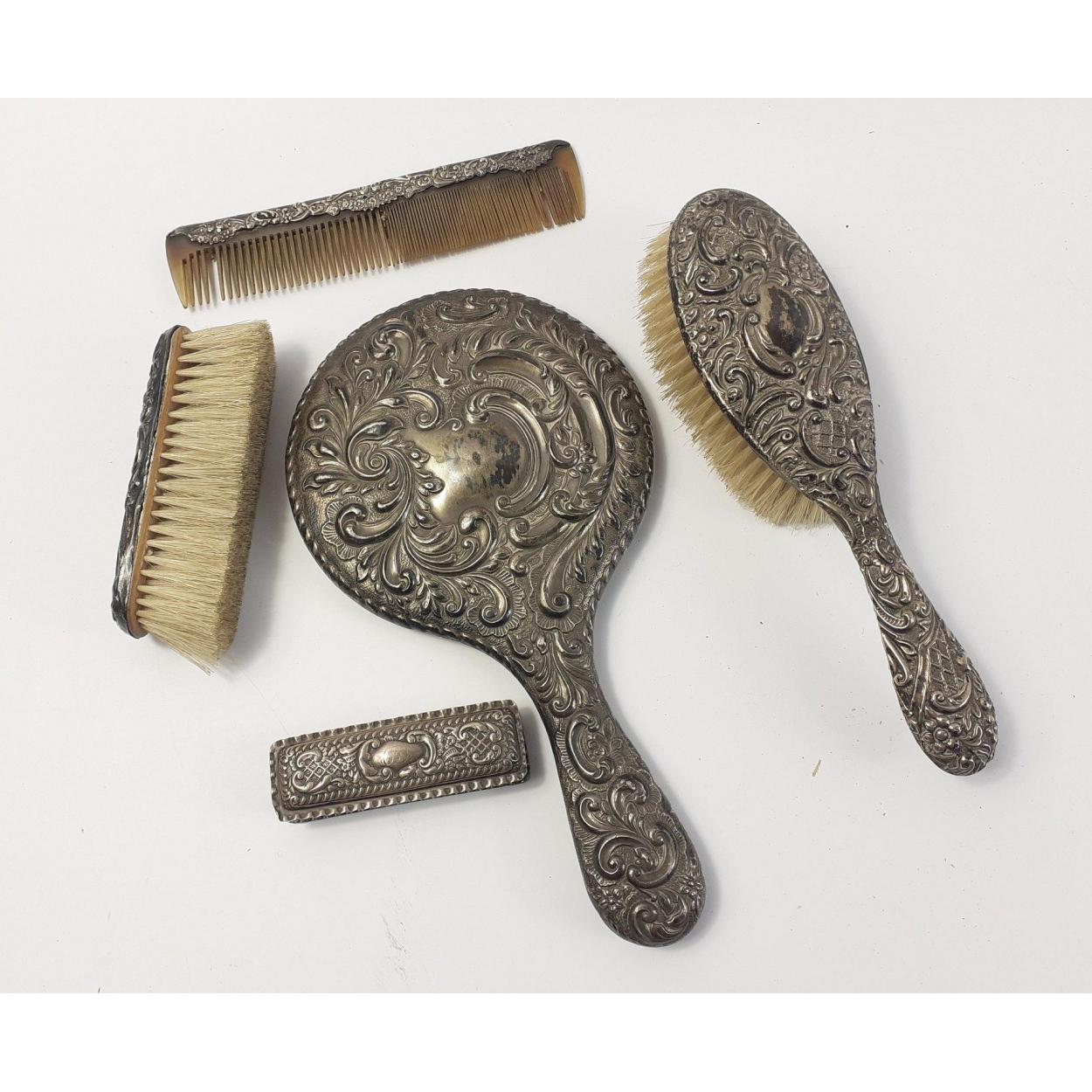 An impressive five piece SILVER dressing table set with unmatched hallmarks. The hand mirror is Chester 1906. The mirror is weighted. Total gross weight of all items is 660g approx. All items are in good used condition.