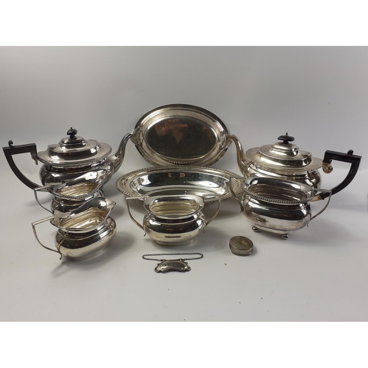 A collection of EPNS items to include dish with cover, two teapots and assorted sugar and cream. A nice collection of well marked items.
