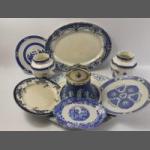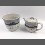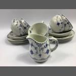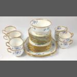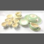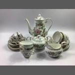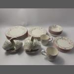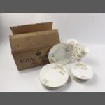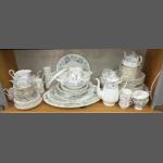 A large collection of ROYAL ALBERT 'Silver Maple' china to include 3 cake plates (23cm dia), 3 platters (42cm and 2 at 38cm length), 3 oval serving dishes (23cm long), 1 round serving dish (24cm dia), 1 lidded serving dish, 1 sauceboat with underplate, 6 plates (26cm dia 1 damage repaired), 5 plates (21cm dia), 6 bowls (20cm dia), 12 bowls (14cm dia), 1 large teapot, 1 small teapot, 1 coffee pot, 6 teacups, 6 coffee cans, 8 saucers (12 cm dia) 6 saucers (13.5cm dia), 7 side plates (15.5cm dia) 2 small creamers, 2 sugar bowls