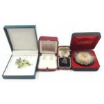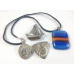 A small collection of four silver items to include a hallmarked sailing ship, an Art Deco style small shield brooch, a school mottos silver badge, and a stone pendant with silver mount. The three hallmarked items weigh 28g approx.