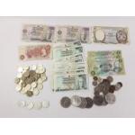 One for the Currency collector !!. UK BANKNOTES to include two Royal Bank of Scotland £20 notes celebrating the Queen Mothers 100th Birthday (worn), a 1983 £10 Royal Bank of Scotland note, 23 one pound notes and a 10/ note. Lot also includes 33 x £1 coins with collectible reverses, 2 collectible £2 coins, four collectible 50p and a small quantity of low denomination coins. Over £100 in face value !