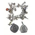 First times a charm ! A lovely sterling silver charm bracelet. Links are stamped 0.925 and charms include, ball & claw, telephone, swan, Eiffel Tower, piano, horse & jockey, ship in a bottle, bear, fruit basket (2 seed pearls missing), ballerina, weather vane house, boot with mice, black stone seal, gypsy caravan, turtle, bird feeder. Also include two separate hall marked St Christopher, Total gross weight 95g