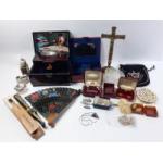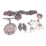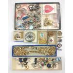 A mixed collection of jewellery including a pair of silver gilt hoop earrings (4cm dia), a pair of Italian brushed silver drop earrings, a small silver brooch 3cm long, a pair of Israel 925 earrings, an ornate silver brooch/pendant with turquoise coloured stone (4cm approx), 2 pendants each 5cm dia,2 boxed beaded necklaces, etc