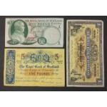 Scottish Banknotes x3 - ROYAL BANK OF SCOTLAND notes in good collectible grade. Minor blemishes but no major folds, rips, tears or penmarks. 1964 £5 with some light staining at bottom, 1962 £1 with some folds, 1967 £1 crisp with minor corner fold